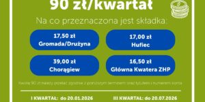 Od stycznia 2026 roku obowiązuje nowa wysokość składki członkowskiej ZHP – 90 zł za kwartał (360 zł/rok). Składka ta zasila działalność wszystkich poziomów organizacji: 17,50 zł — gromada/drużyna 17,00 zł …