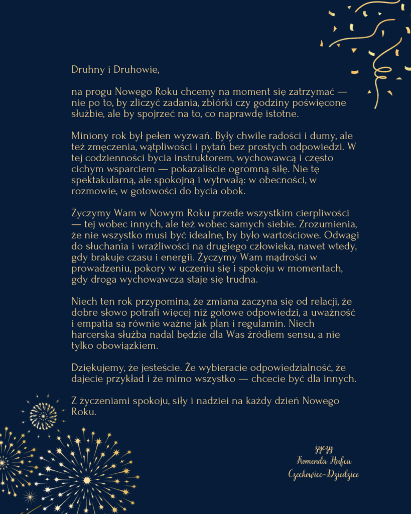 Przekazujemy życzenia noworoczne od naszej Komendy Hufca. Dodatkowo informujemy o odprawie online, która się odbędzie w dniu 19 stycznia 2026 r. o godz. 18:30.